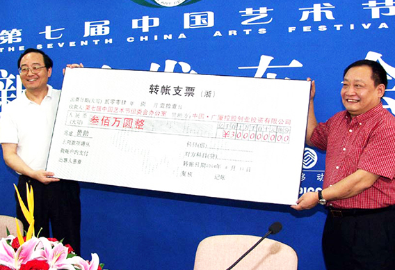 2004 年捐贈(zèng) 400 萬(wàn)元設(shè)立浙江傳媒學(xué)院 “ 傳媒獎(jiǎng)學(xué)金 ” ;捐資 300 萬(wàn)元獨(dú)家贊助第七屆中國(guó)藝術(shù)節(jié)開(kāi)幕式文藝晚會(huì),安排工人、軍警、教師、民工四個(gè)專場(chǎng)讓普通群眾免費(fèi)欣賞高水平、高層次的文藝演出。 同年,投資 6000 多萬(wàn)元與浙江廣電集團(tuán)組建浙江影視集團(tuán),并投資 300 萬(wàn)元組建錢(qián)江浪花藝術(shù)團(tuán)。
